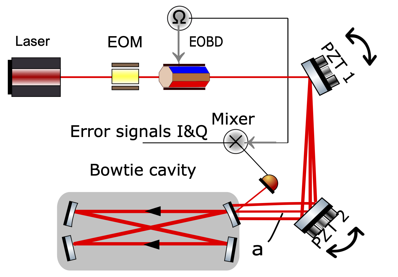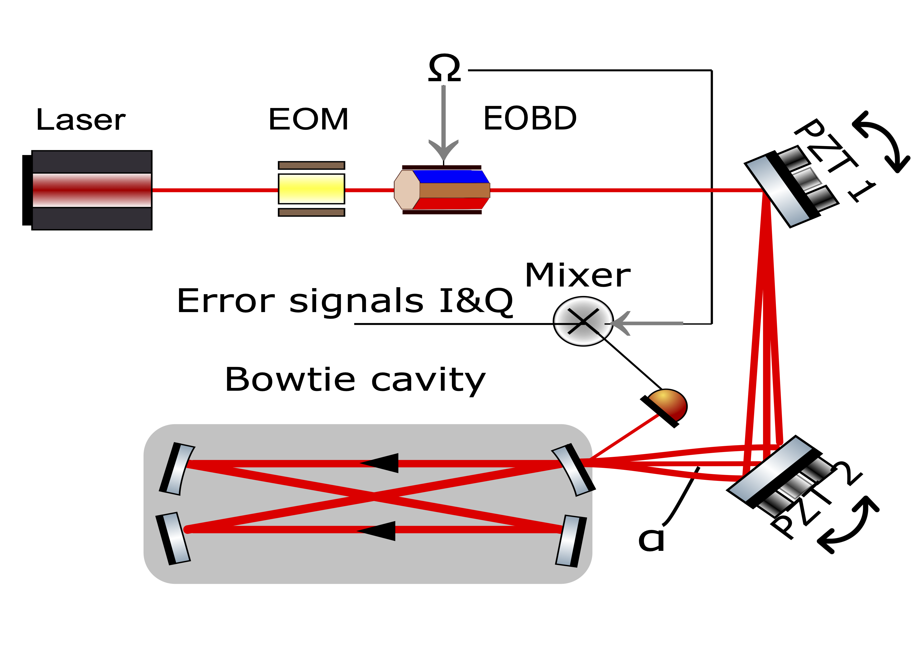 I investigate a new alignment sensing scheme for optical cavities named Radio Frequency Jitter Alignment Sensing Scheme (RFJAS). This scheme is proposed to work along with the currently used WaveFront Sensing Scheme. RFJAS relies on using an electro-optic beam deflector to generate first higher order modes (HOM) sidebands. These sidebands case be used to beat with first HOM from misalignment. Demodulating this beat signal recovers full alignment of the optical cavity, when operating the correct modulation frequency. A schematic of the setup is attached. In there we see the laser source, the electro-optic beam deflector, and 2 steering mirrors that I call PZT1 and PZT2, then the optical cavity.